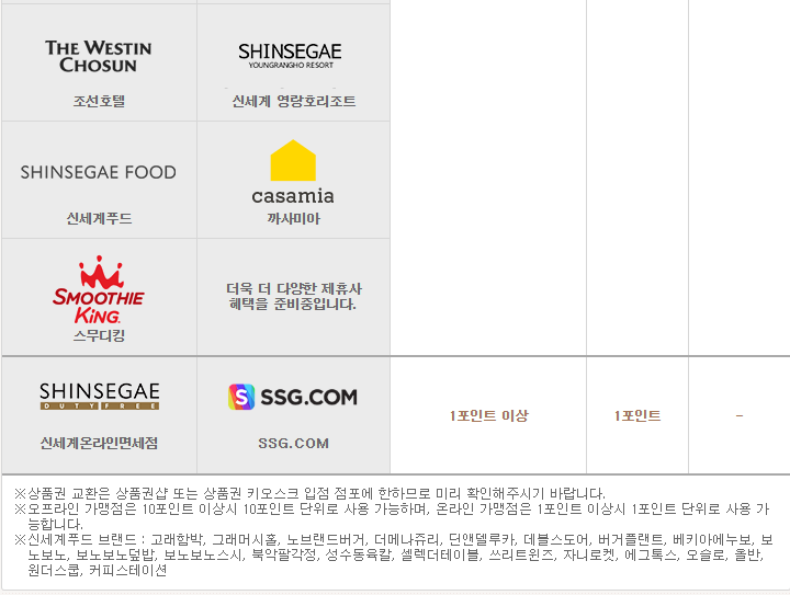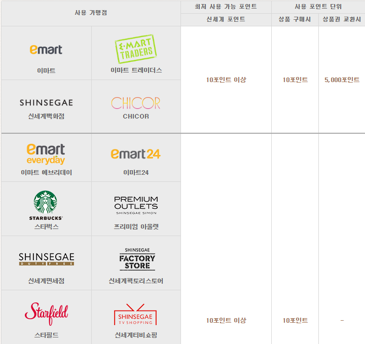 위의 이미지와 같이 신세계 그룹에서 운영하는 거의 대부분의 곳에서 사용이가능합니다