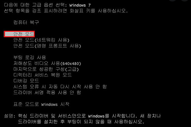이런화면이 뜨면 안전모드로 부팅하시면되고