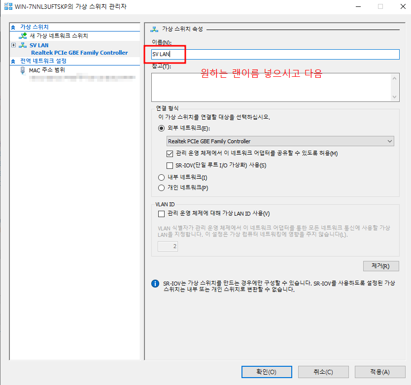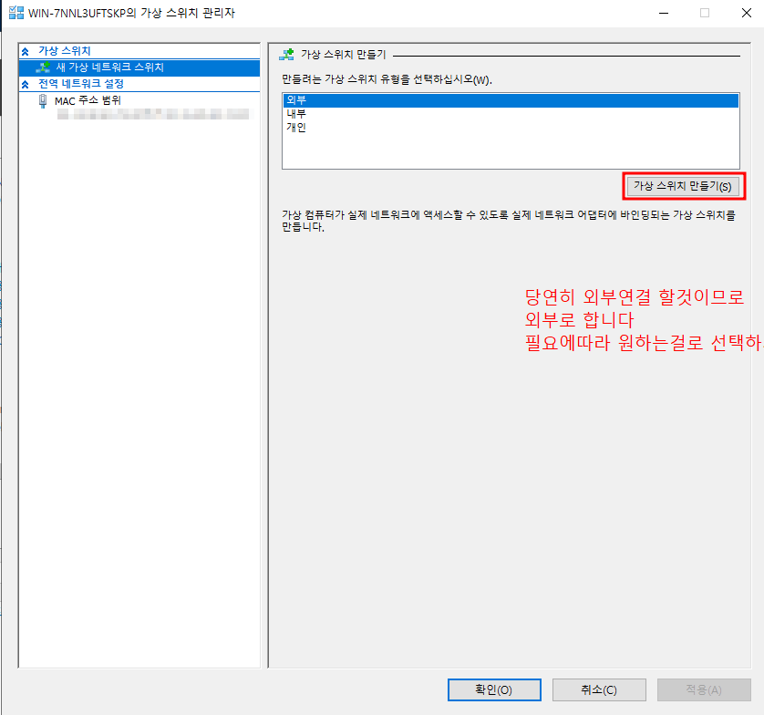 해당 가상스위치 먼저 만들어놓고 가상 컴퓨터를 만드셔야 차질없이 진행가능합니다