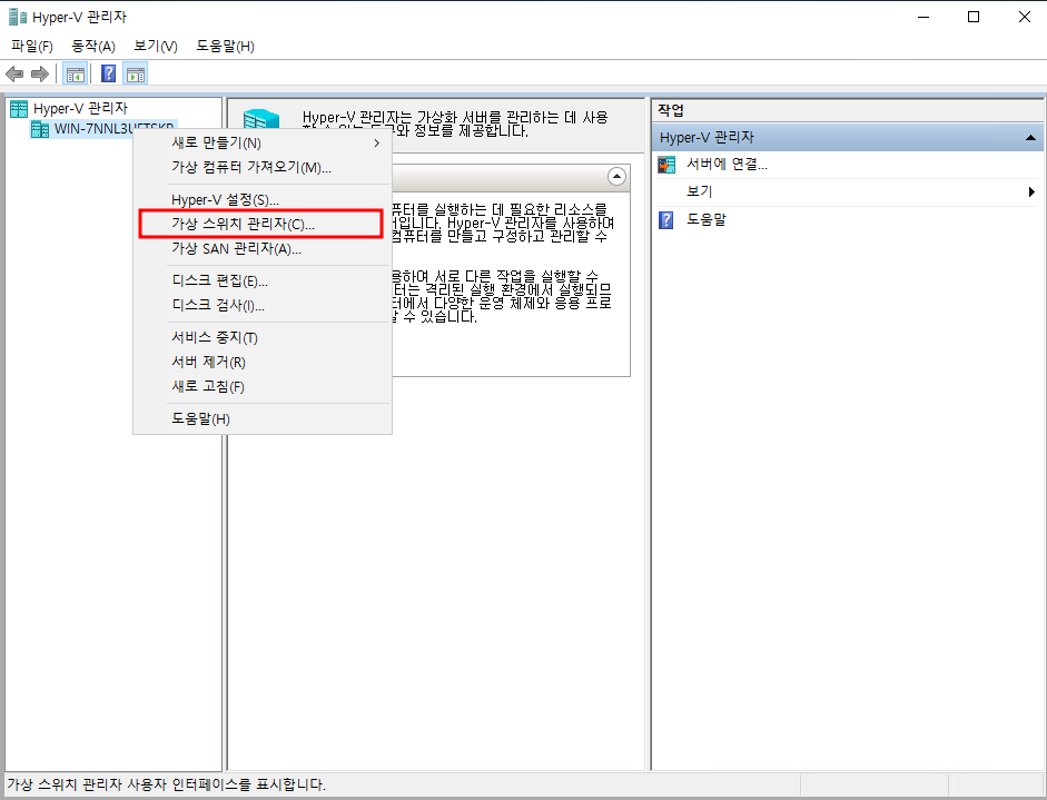 하이퍼v 실행후 본인의 pc에서 우측클릭후 가상 스위치 관리자 를 클릭합니다