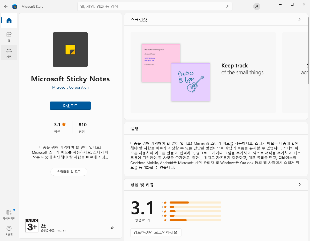 실행후 microsoft sticky 검색해서 설치하시면 됩니다!